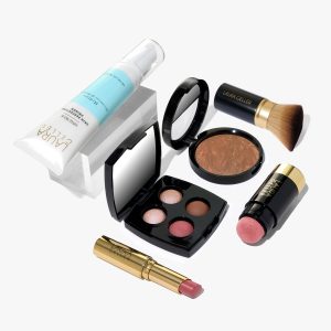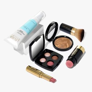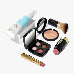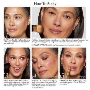 This 6-piece kit includes Baked Balance-n-Brighten Color Correcting Foundation. Spackle Skin Perfecting Primer: Hydrate. Serum Blush Cheek Tint in Practical Pink. Jelly Balm Hydrating Lip Color in the shade In the Buff. Baked Eyeshadow Quad. and our Retractable Angled Kabuki Brush.