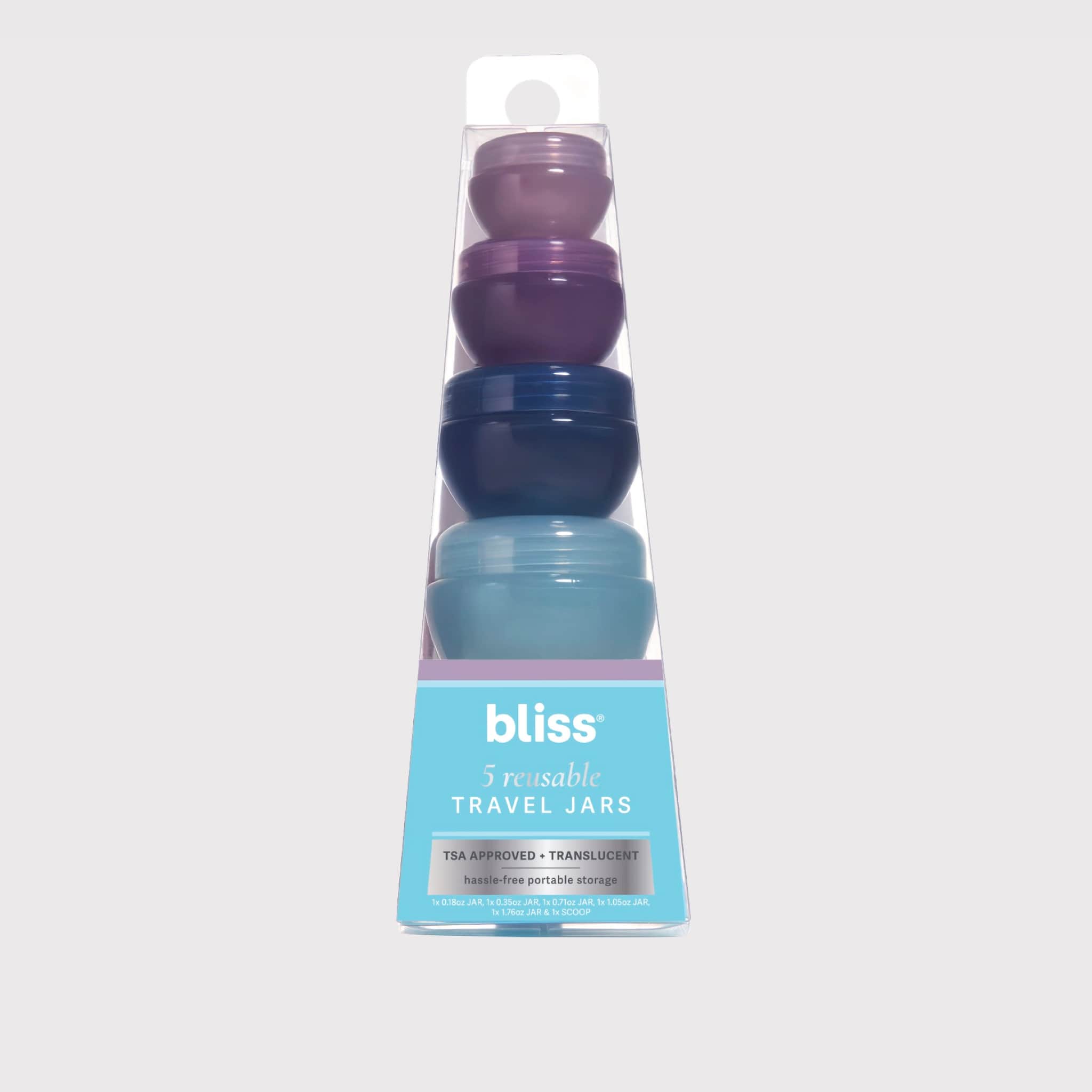 Keep glowing. wherever you’re going! These translucent TSA-approved travel jars securely store all of your beauty and small travel essentials to keep up your routine while you’re traveling. Each jar has a leak-proof design to keep things mess-free in transit. Use the included spatula to scoop over your favorite Bliss serums. cleansers. or moisturizers to keep them close at hand.